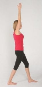 Step back with the right leg while raising the right arm over your head. Make sure both feet are facing forward and the hips are tucked under. Do not overly shrug the shoulder of the arm being raised. Complete the movement on the right side by stepping forward with the right leg while bringing the arm down then step backward with the left leg and raise the left arm to complete the movement on the left side. Repeat on both sides 3 – 5 times at least once per day.