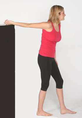 To evaluate the ability of the arm to internally rotate coach your client to stand arm distance away from and facing a wall (Figure 2). Instruct them to raise their left arm and place their left palm flat on the wall with their arm straight and fingers pointing upward. Have them retract and depress their left shoulder blade and keep their arm straight as they slowly turn their body away from the wall. As they turn, keep your hand on their left shoulder blade to make sure it remains depressed and retracted (i.e., stable). Tell your client to stop turning as soon as their left shoulder blade moves or their left arm bends. If they are able to successfully turn 90° away from the wall without their shoulder blade moving or left arm bending, progress to the next part of this assessment (see below). However, if they are unable to turn their body to 90° without compensating, you know they first need exercises to loosen up the muscles of the arm and shoulder to create mobility in the glenohumeral joint and/or strengthening exercises to help stabilize the scapula before progressing.