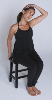 To evaluate the position of the neck and head instruct your client to sit on a chair with their feet firmly on the ground. Place your hands gently on both of their shoulders and coach them to bend their neck to the right as though they are trying to touch their right ear to their right shoulder (Figure 3). As they perform this movement, gently push down on their shoulders so they do not shrug either shoulder and coach them not to rotate their neck and head either forward or backward. (This assessment is designed to evaluate movement in the frontal plane: i.e., a side bend of the neck only). Have your client bend their neck and head to both sides and evaluate which direction/side they find easiest. If they find it easier to bend their neck and head to the right, it is indicative that their neck is typically bent in that direction. If they find it easier to bend their neck and head to the left, it indicates their neck is bent to the left. In either case, a bend in their neck means their head is out of alignment too. The results of this assessment can help you choose self-myofascial release and stretching exercises for the side of the neck that is restricted. Releasing restrictions will create more balanced movement of the neck and head, help center these structures over the spine, pelvis and legs, and decrease neck and shoulder pain.